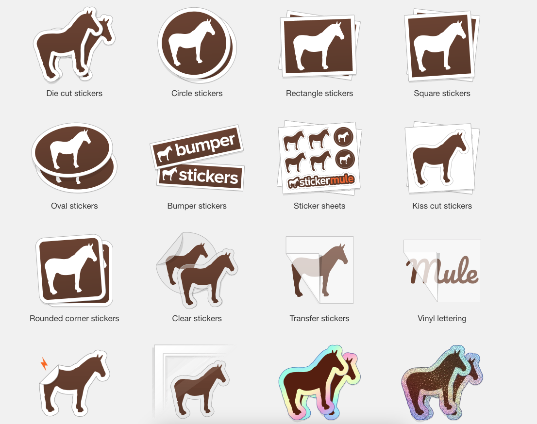 Sticker Mule is our favorite spot to go for custom stickers and labels. Not just for the fast and free shipping and the quality of the products either, but for the variety as well. Their catalog includes stickers in several shapes, die-cut stickers, sticker sheets, and more.